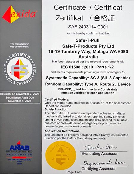 Safe-T Pull has been successfully certified to IEC 61508 as a SIL 3 Capable system.